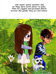 Mabel and Blister are playing outside with his dog PJ when someone they didn’t expect suddenly enters their backyard. What happens next only makes sense if you consider there are more than five of them! Mabel learns there’s more to life than getting everything she ever wanted, that there’s things she needs, too. Together with Blister and PJ, they enter a world surrounding them they never really understood before, complete with rainbow lakes, butterflies that smell like lavender, musical toadstools, and gummee bear trees.